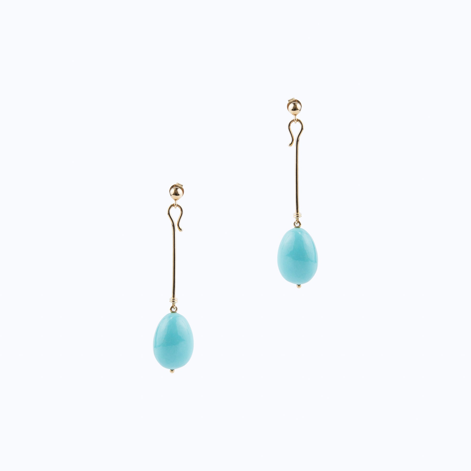 Bold and modern, the Anca Earrings feature smooth egg-shaped turquoise balls suspended from sleek 18ct yellow gold settings. The vibrant blue of the stones creates a striking contrast with the warm gold, while the elongated drop design adds movement and elegance. Perfect for adding a contemporary pop of color to any outfit, these earrings are both sculptural and versatile.