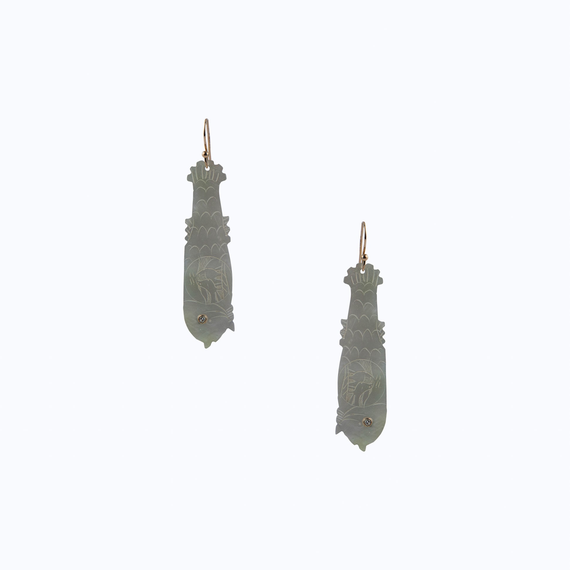 Delicately carved by hand, the Diamond Eye Fish Earrings feature luminous mother of pearl fish, each set with a single diamond eye. Suspended from elegant gold hooks, the design combines artisanal craftsmanship with subtle sparkle, creating gentle movement and refined character. Distinctive yet understated, these earrings bring a sense of storytelling and elegance to everyday wear.