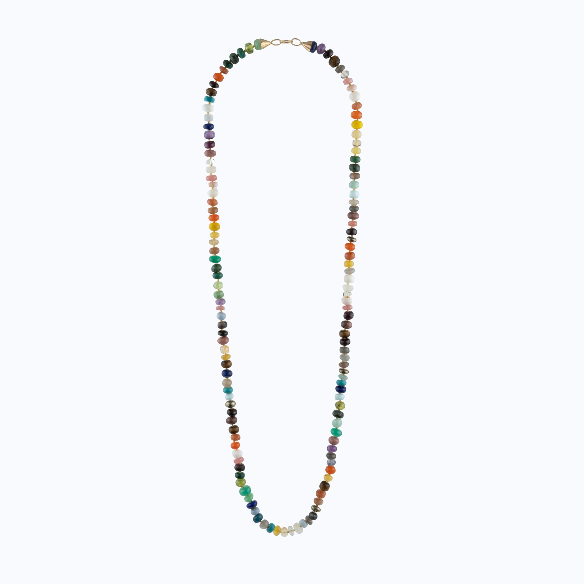 Vibrant, playful, and exquisitely crafted, the Joni Rainbow Necklace features a mix of rainbow moonstone beads strung along a golden hand-knotted thread, secured with a sleek cone lock. Measuring 80 cm, it drapes beautifully for layering or stands out as a striking statement piece on its own. Designed to also accommodate charms or pendants, it offers a personalised touch to a colourful, modern luxury accessory.