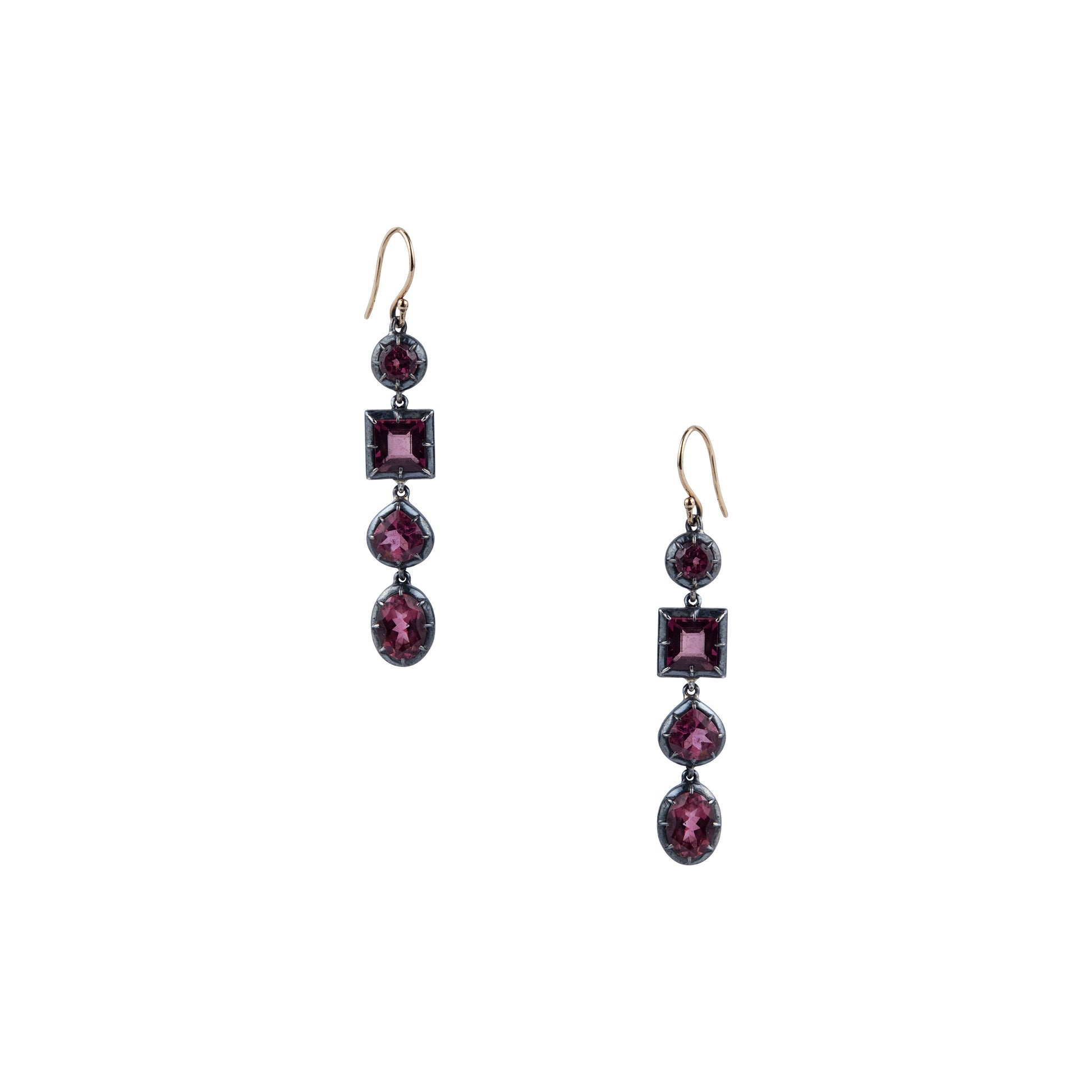 Regal and striking, the Cleopatra Cluster Earrings feature a cascading line of multi-shaped Pink Tourmaline, each suspended in a graceful interplay of 18ct yellow gold and oxidised silver. The varying Pink Tourmaline shapes create a dynamic, rhythmic silhouette, while the contrast of darkened silver and luminous gold enhances the depth and brilliance of each gem. Inspired by timeless elegance and bold statement design, these earrings offer a dramatic, yet refined, touch to elevate any ensemble.