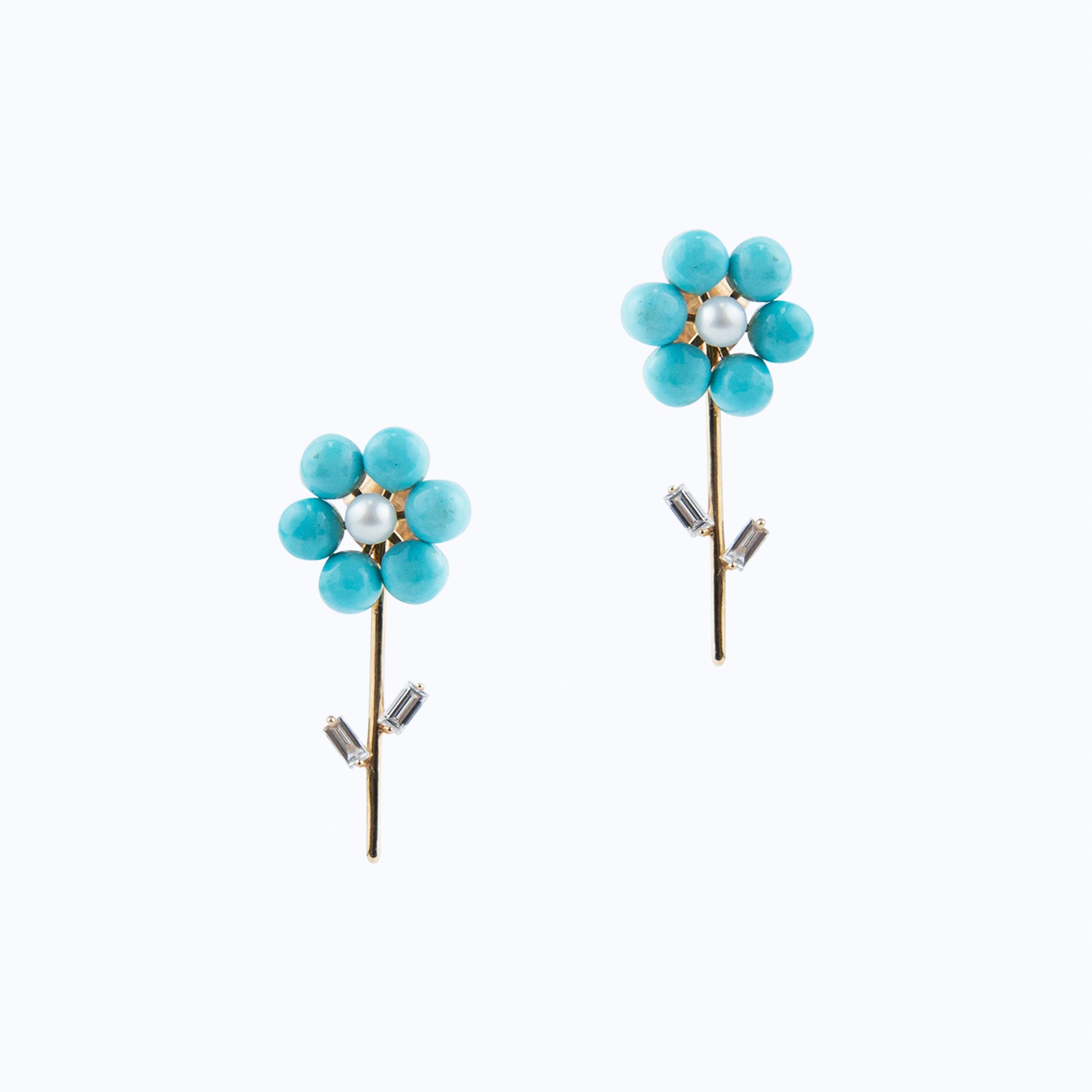 Artful and vibrant, the Flora Stud features a luminous pearl at its center, framed by turquoise petals and accented with diamond “bugs” for the leaves, all set in 18ct yellow gold. The combination of soft, vivid, and sparkling elements creates a playful yet elegant floral motif. Perfect as a statement stud or layered with complementary pieces, these earrings celebrate craftsmanship and contemporary design.